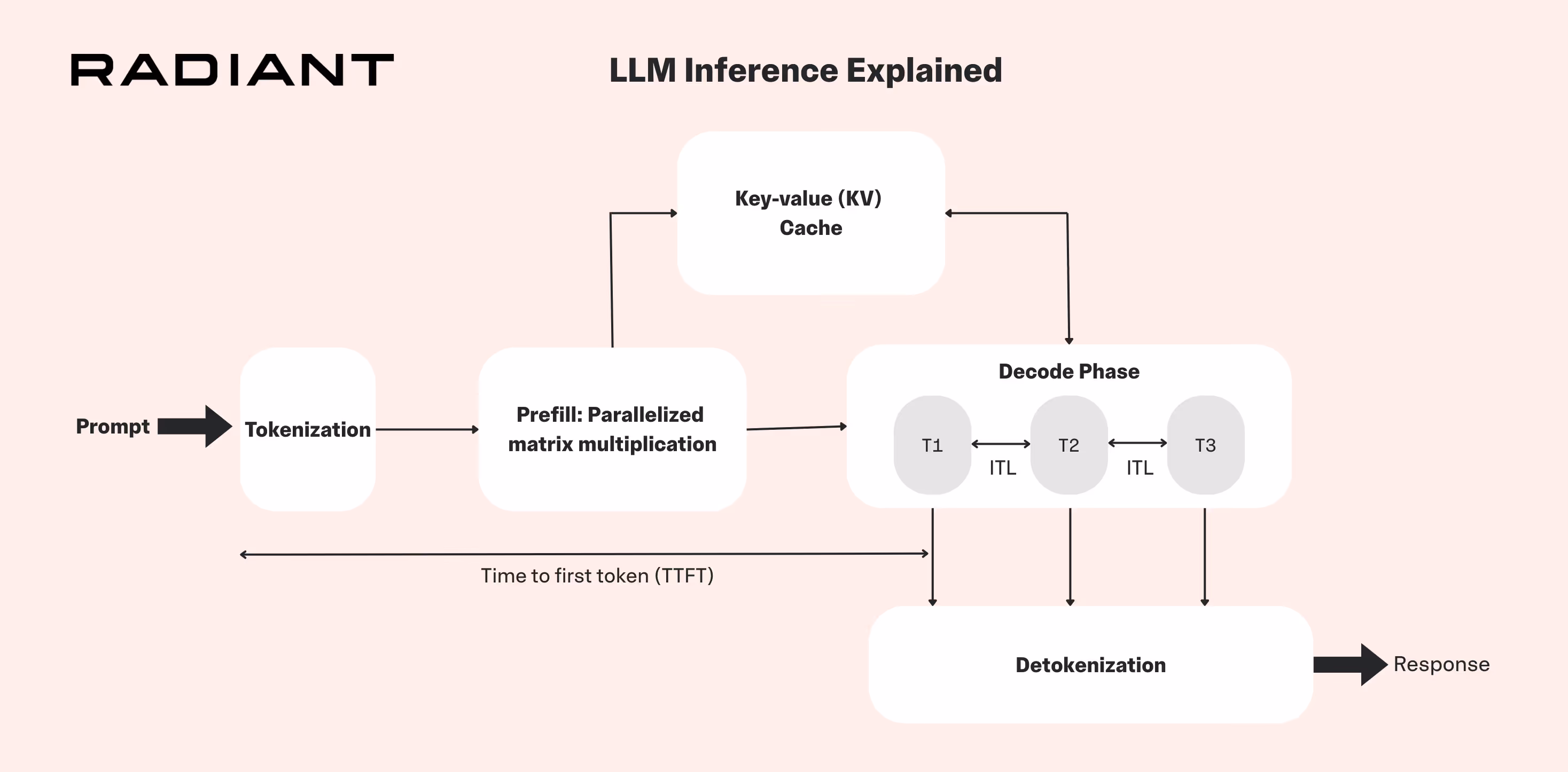 - Prefill (context build). The model ingests the user’s entire prompt, constructs the key–value (KV) cache, and emits the first token. Because all input tokens are known up‑front, kernels run in parallel, so the work is compute‑bound; this phase largely sets time‑to‑first‑token (TTFT).